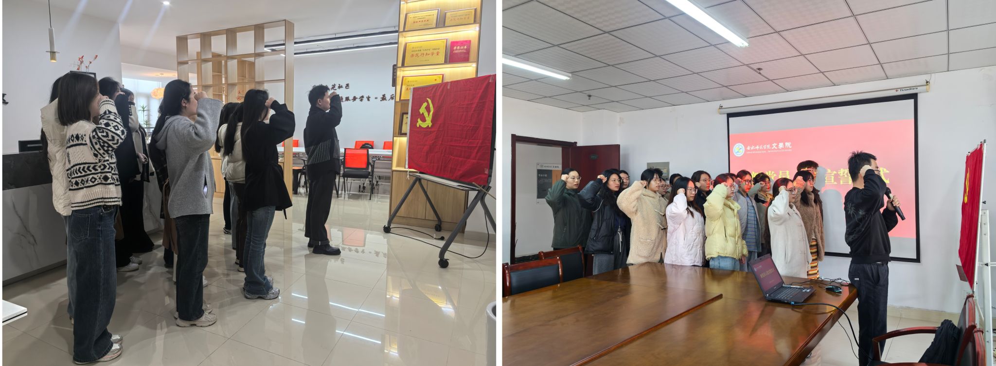 根据学院党员发展工作安排,12月10日中午,ok138cn太阳集团2025年下半年新党员入党宣誓仪式分别在锦绣校区学院会议室、滨湖校区“集萃文苑”一站式社区同步举行,学院党委书记许锃、副书记夏娟、各学生党支部书记以及下半年新发展党员参加。党支部书记疏淑进、曹甜甜分别在两校区主持宣誓仪式。