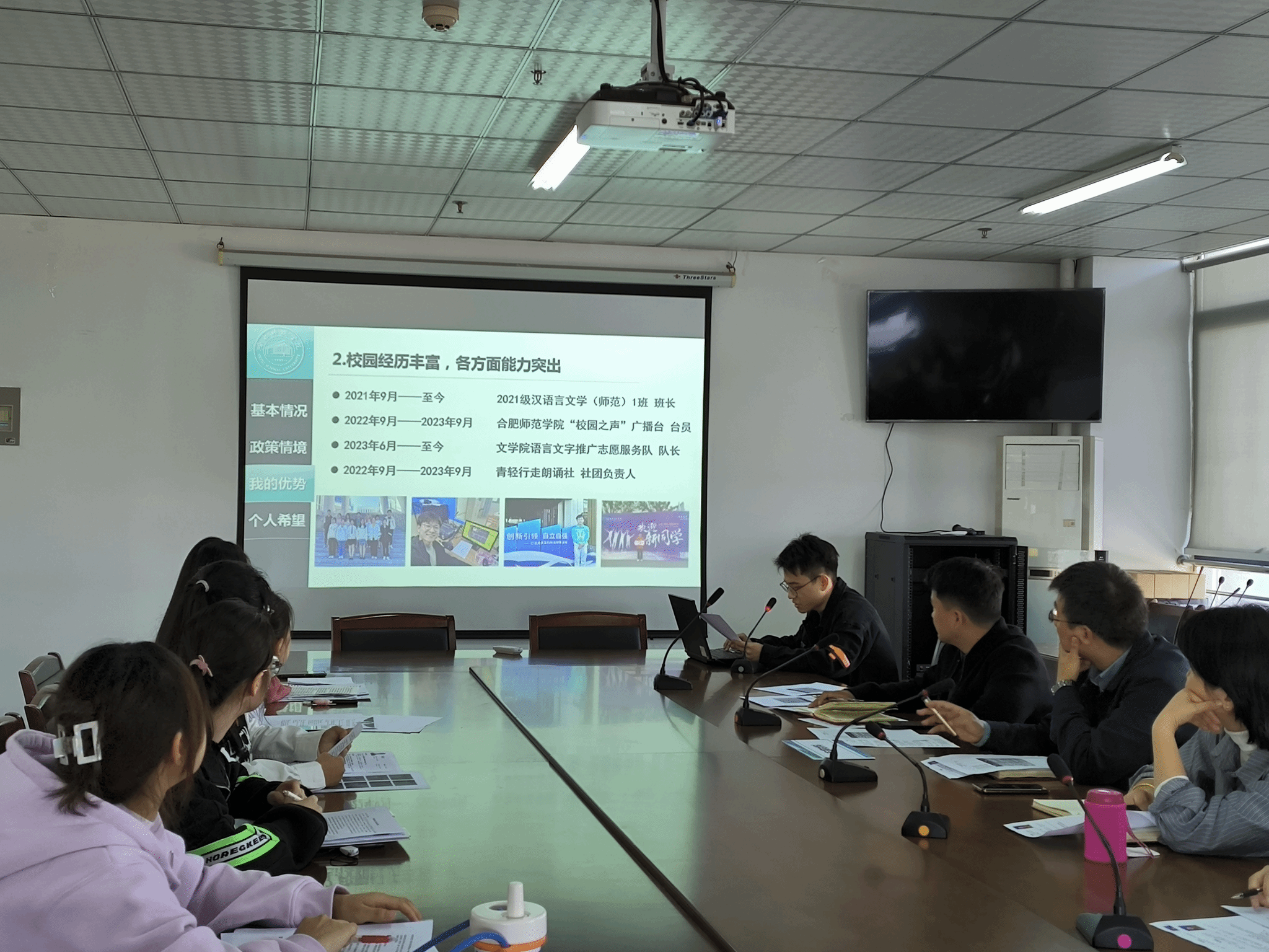 参赛学生们准备充分,朝气蓬勃,从赛前的简历制作到赛场上的精彩表现,无不彰显着文院学子的独特风采。2021级汉语言文学(师范)专业安晓晓同学,“知己知彼”“决策行动”等,谈成为文化讲解员的愿景;2021级汉语言文学(师范)专业的朱幸武同学从基本情况、政策情境、个人优势以及未来展望等几个方面,表达了自己想要成为一名乡村特岗教师的愿望。2022汉语言(师范)专业薛子怡同学则从个人实际出发,希望自己可以成为一名乡村推普工作者,用自身行动推动乡村推普工作。参赛学生们在比赛中相互学习,共同进步,在交流中收获成长,在切磋中打磨经验。
