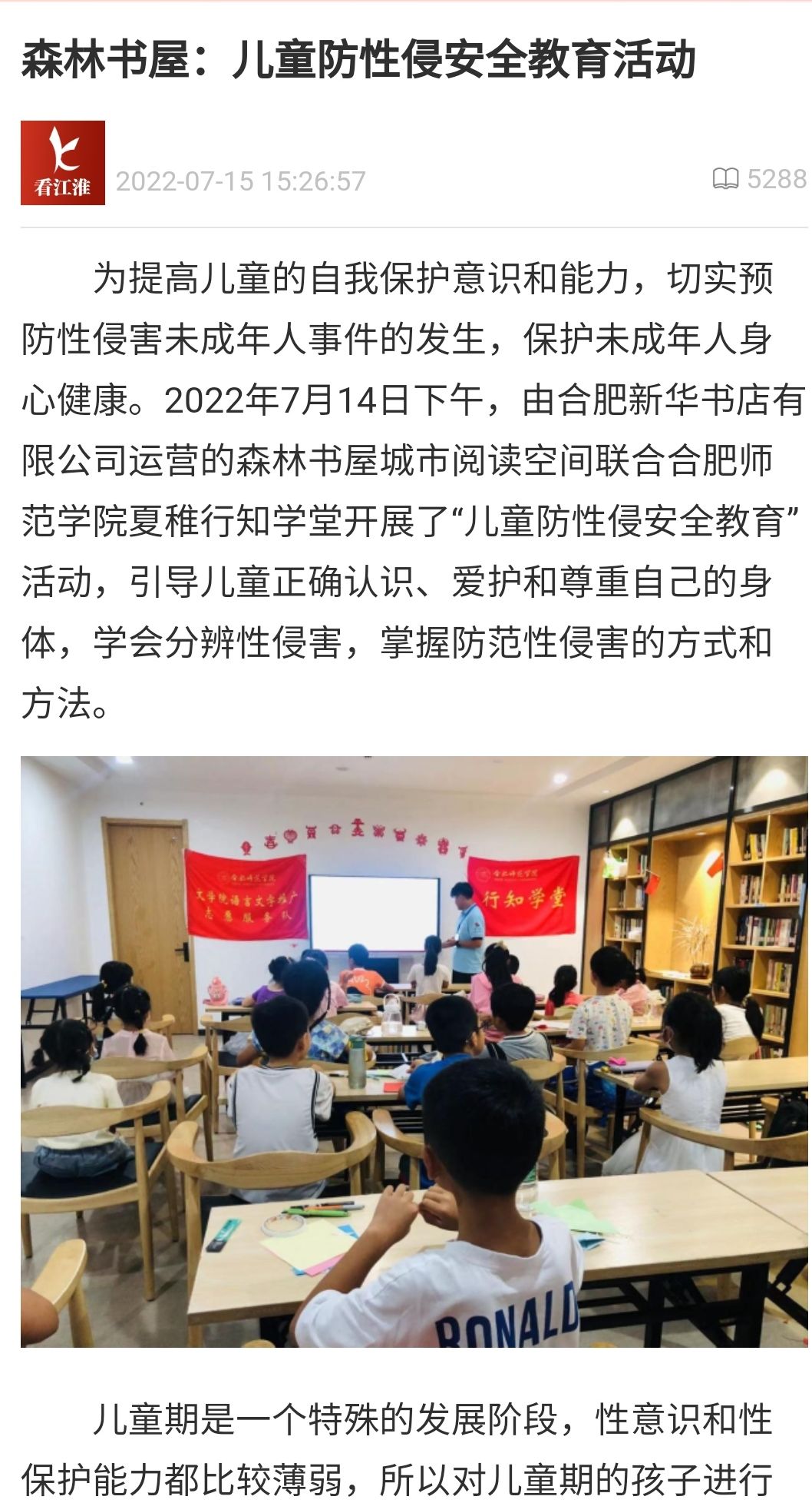 2022年7月4日下午,合肥市经开区森林树屋联合OK138太阳集团夏稚行知学堂开展“儿童防性侵害安全教育”活动,引导儿童正确认识、爱护和尊重自己的身体,学会分辨性侵害的类型,掌握防范性侵害的方式和方法。