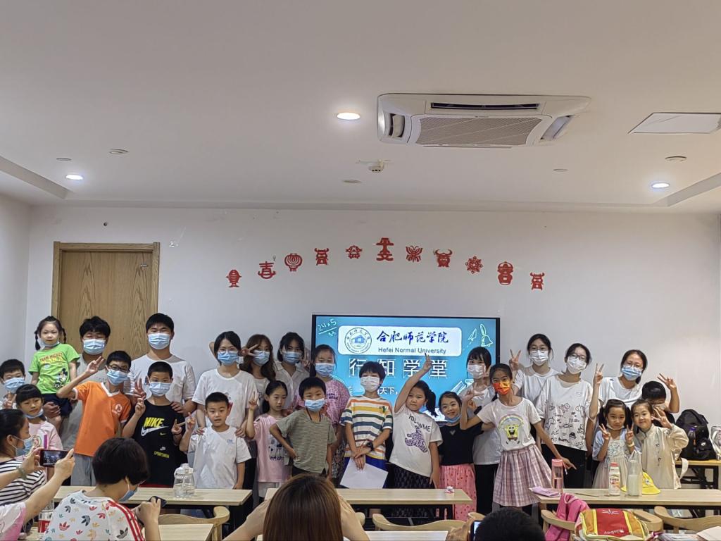 此次开班仪式是由夏稚行知学堂的领队小先生——陈睿主持的。首先,她向全体同学和家长介绍了我院行知学堂的办学理念、办学背景以及学堂的概貌。行知学堂自开办以来,一直深受广大学生的喜爱,在安徽多地以公益课堂为形式开展,引导青年学生实践出真知、实践长真才,也曾多次被《中国青年报》《人民日报》等报刊或网页刊登宣传。本次夏稚行知学堂以“思想教育”“兴趣培养”“科学普及”“情感教育”“心理辅导”“劳动教育”“公益实践”“安全防护”“课业辅导”为主要内容,开展了十五项课程,并安排专门的小先生进行教学教导。