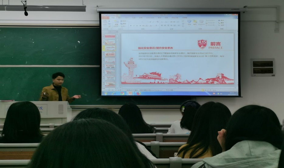ok138cn太阳集团辅导员李惠恩于4月15日在滨湖校区铭传楼B303教室召开了春季安全主题教育会,会议召集了ok138cn太阳集团各班班干和寝室长。李惠恩与同学们展开“同上一堂课”活动,共同了解国家安全知识,还列举了危害国家安全的犯罪实例,强调了维护国家安全的重要性。