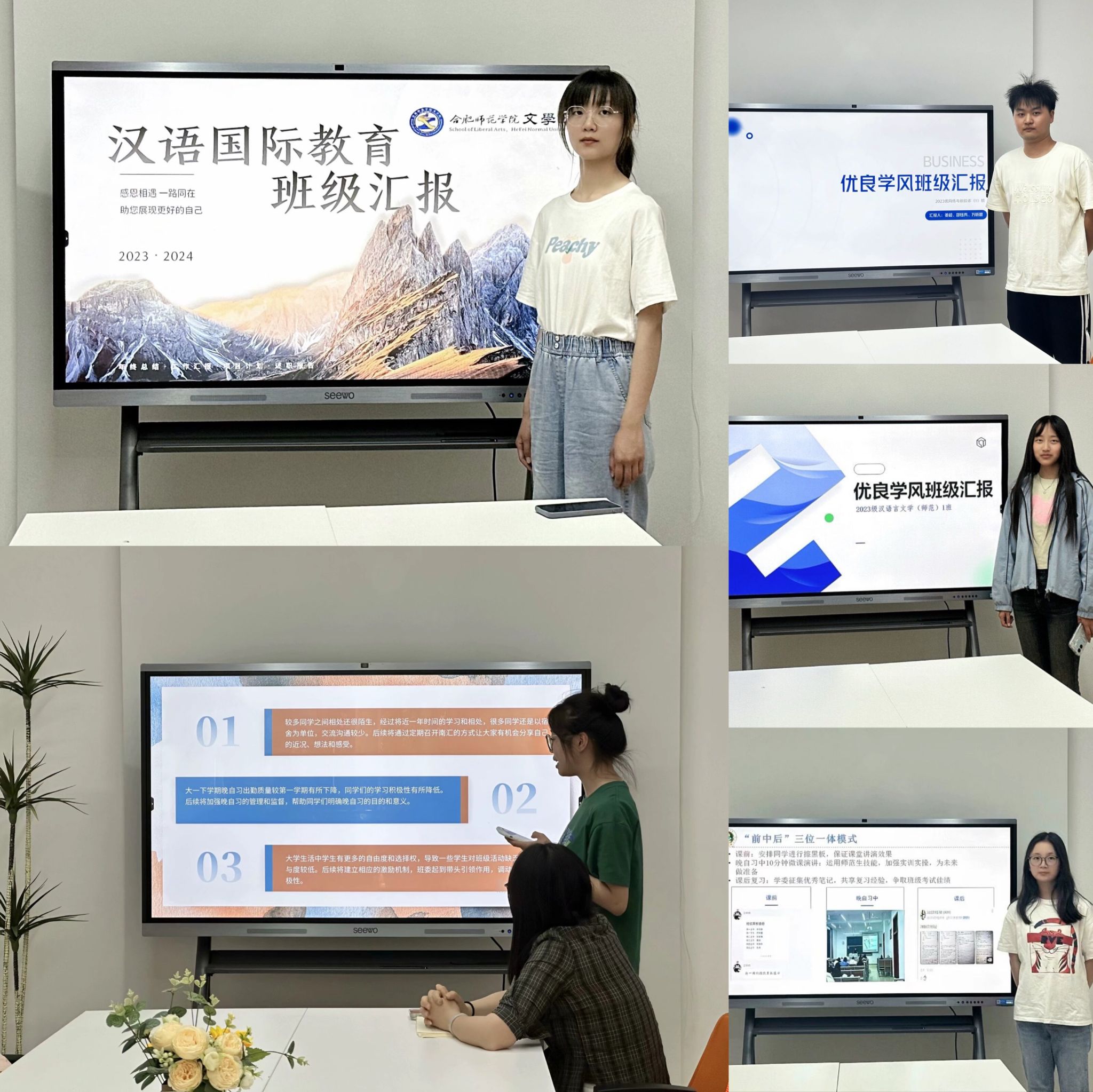 各班负责人通过PPT回顾了本班过去一年在思想建设、学风介绍、班级文化、实践锻炼等方面的工作成果,并分享了各自的班级工作经验和心得体会。2023级汉语言文学(师范)1班将理论与实践的相结合,并且经常在班级活动的实践中检验并且改良班级管理的方式;2023级汉语言文学(师范)2班结合专业特色开展各项实践活动,班级成员积极参与各种班级活动,在“合肥马拉松”“安博花朝节”和“行知学堂”等志愿服务活动中都有着很多班级成员的身影;2023级网络与新媒体1班强调班级的凝聚力,班级内部成立了互助小组,积极应对面临的困难;2023级网络与新媒体2班注重宿舍问题,班级里不仅宿舍关系和谐,而且宿舍卫生干净,环境整洁;2023级汉语言国际教育班级强调班级的学风的建设,管理制度条理清晰,班级学风自律向上。