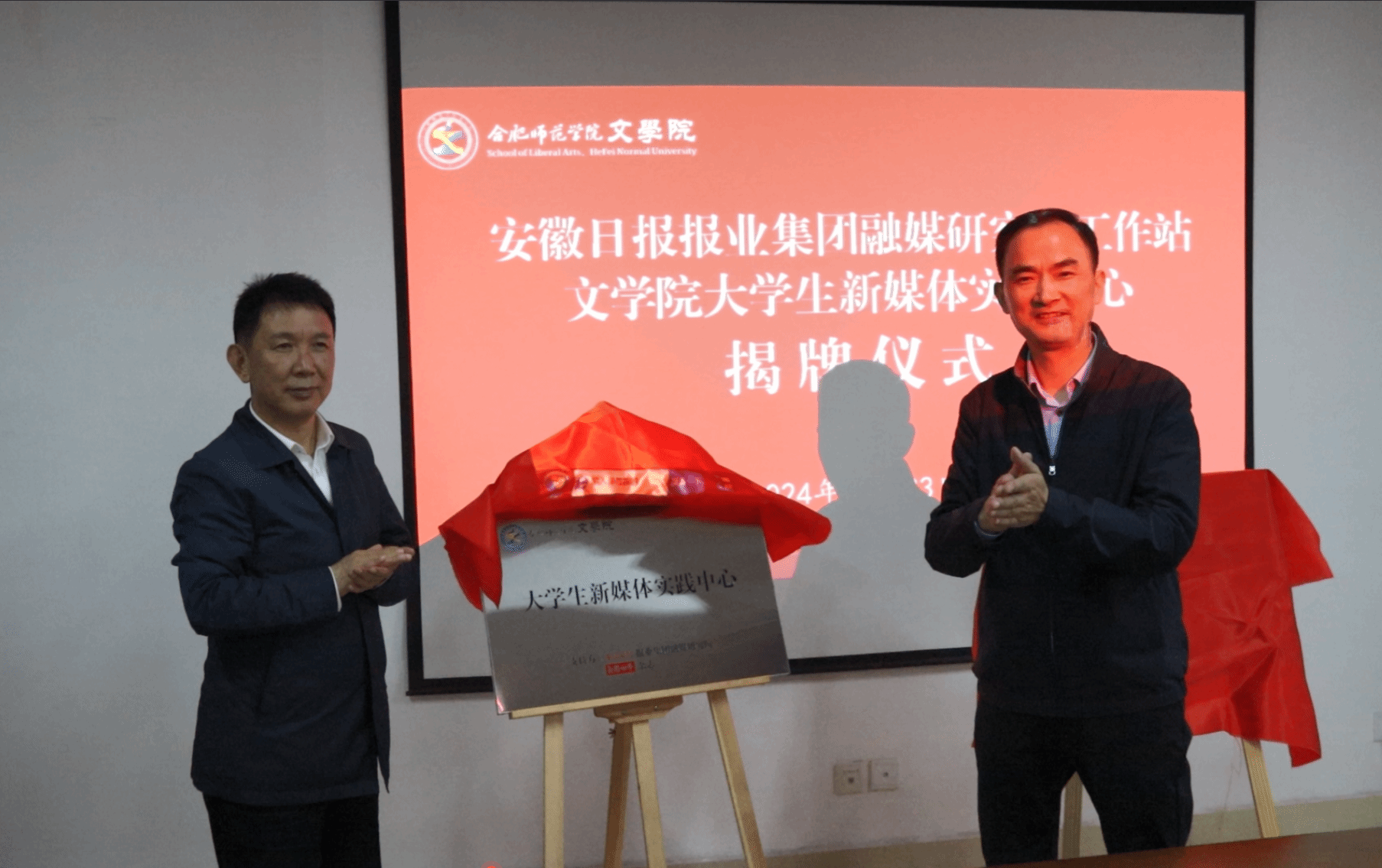 徐文林、高前明为安徽日报报业集团融媒研究院工作站、ok138cn太阳集团大学生新媒体实践中心揭牌,工作站和实践中心正式成立。