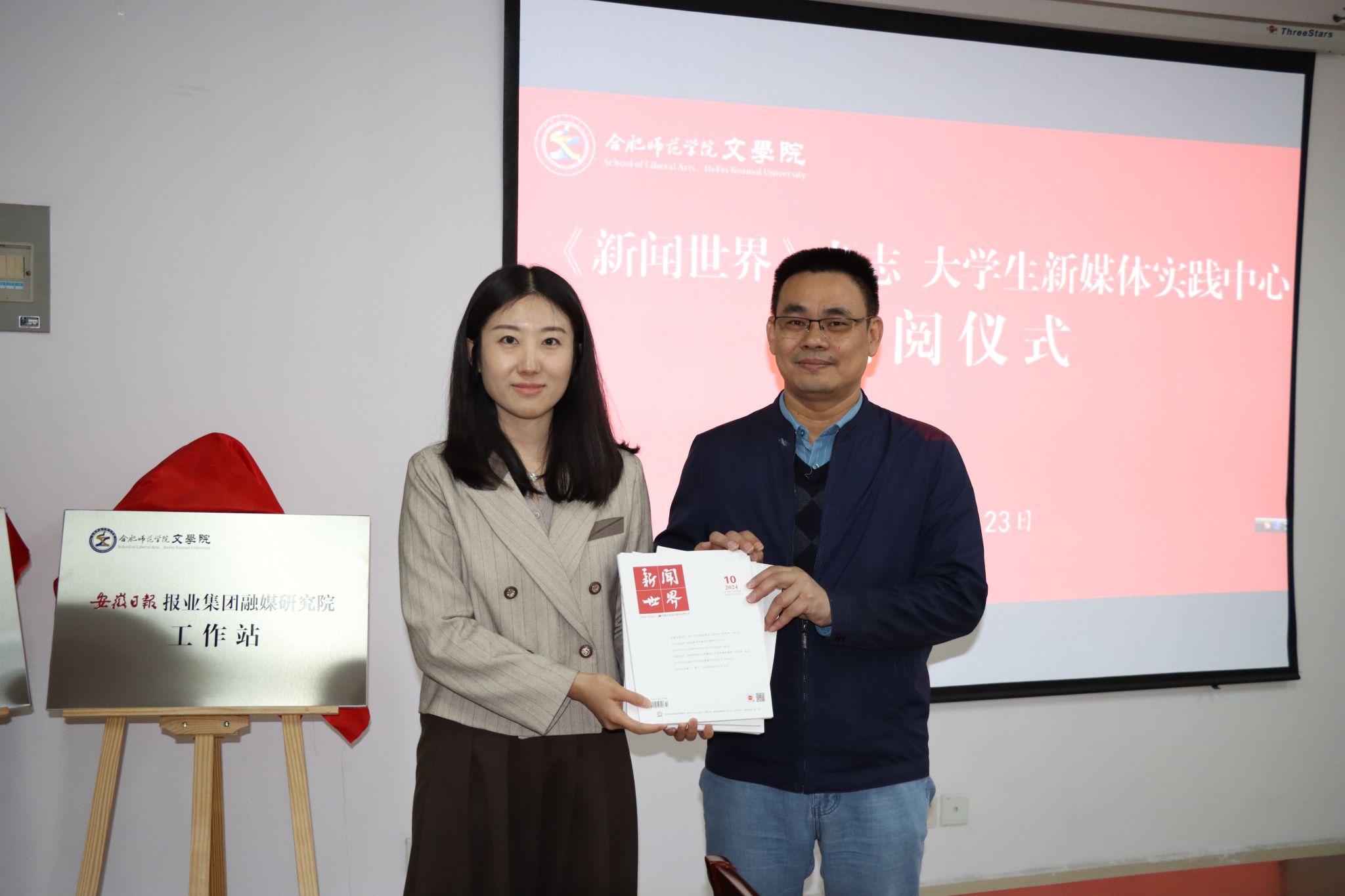 10月23日,安徽日报报业集团融媒研究院工作站、ok138cn太阳集团大学生新媒体实践中心揭牌仪式在锦绣校区行知楼802会议室举行。院党委委员、纪委书记、监察专员徐文林出席仪式并揭牌,安徽文摘报刊社社长高前明、副总编刘纯友、全媒运营中心主任邵先锋,ok138cn太阳集团党政班子,中文系、新闻传播系负责人参加会议。会议由ok138cn太阳集团党委书记许锃主持。