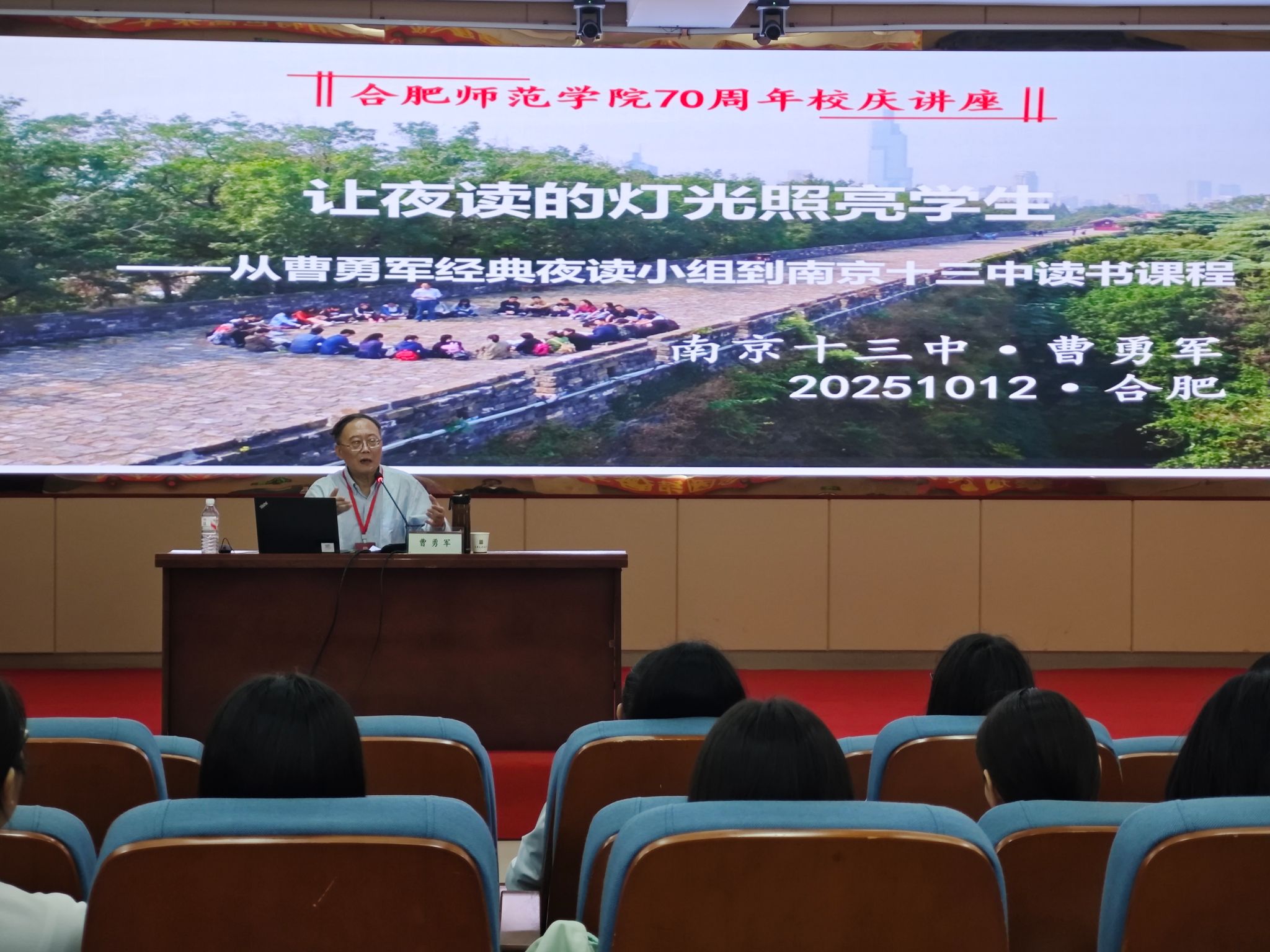 10月12日下午,由OK138太阳集团科研处和ok138cn太阳集团联合主办的70周年校庆学术讲座活动在锦绣校区学术报告厅举行。ok138cn太阳集团1986届校友,江苏省特级教师、南京市十三中教授级高级教师曹勇军作了题为“让夜读之光照亮学生——从曹勇军经典夜读小组到南京十三中读书课程”的学术讲座。学院2024级、2025级学科语文教育硕士研究生和部分汉语言文学专业本科生参加讲座,讲座由ok138cn太阳集团院长何旺生主持。