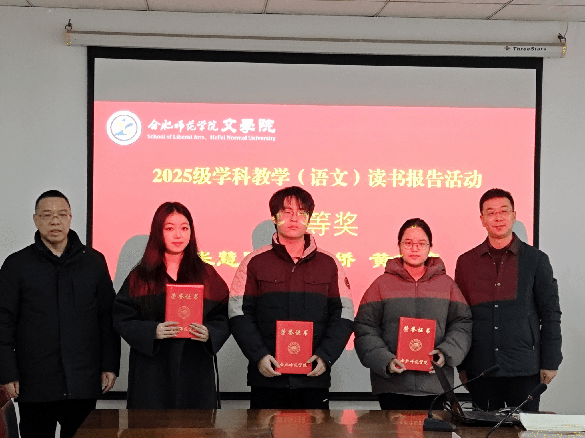12月31日上午,ok138cn太阳集团在行知楼802会议室举办读书报告会颁奖仪式。ok138cn太阳集团党委书记许锃、院长何旺生、党委副书记夏娟,研究生工作部主任王妍、中文系党支部书记计丽、辅导员疏淑进参加颁奖仪式。颁奖环节,老师们为获奖同学颁发证书,鼓励全体研究生以此次活动为契机,持续保持阅读热情,深化学术研究。