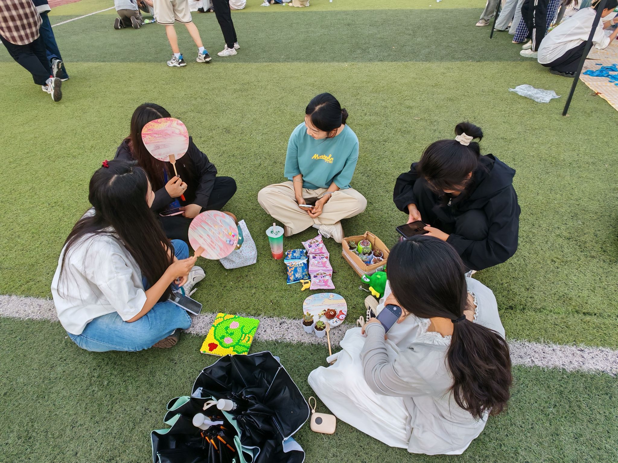 手工DIY活动区,非遗漆扇制作、国风手链、奶油胶发卡、毛球画diy等活动,共同为同学们提供了展现创意与传承文化的平台。非遗漆扇”的制作从空白到缤纷,每一步都充满惊喜,水中一转一漂,精美的图案便跃然纸上;奶油胶发卡diy制作环节,学生们神情专注,反复斟酌细节,沉浸式体验的创造乐趣;“毛球画DIY”活动打开学生们的想象力,缤纷、阳光、活力的“多巴胺”毛球让色彩灵感与独一无二的创意合二为一,开启了一段启迪美学的治愈之旅;“国风手链DIY”活动则聚焦新中式美学,晶莹剔透的珠子折射出五彩的光芒,学生们将各色的编织线左绕右转、挑线压线,让传统在指尖活起来,把春日玩“出圈”。文院学子在千年传统文化的体验中感受着生命的多彩与缤纷,体验着独属于他们的独家记忆。