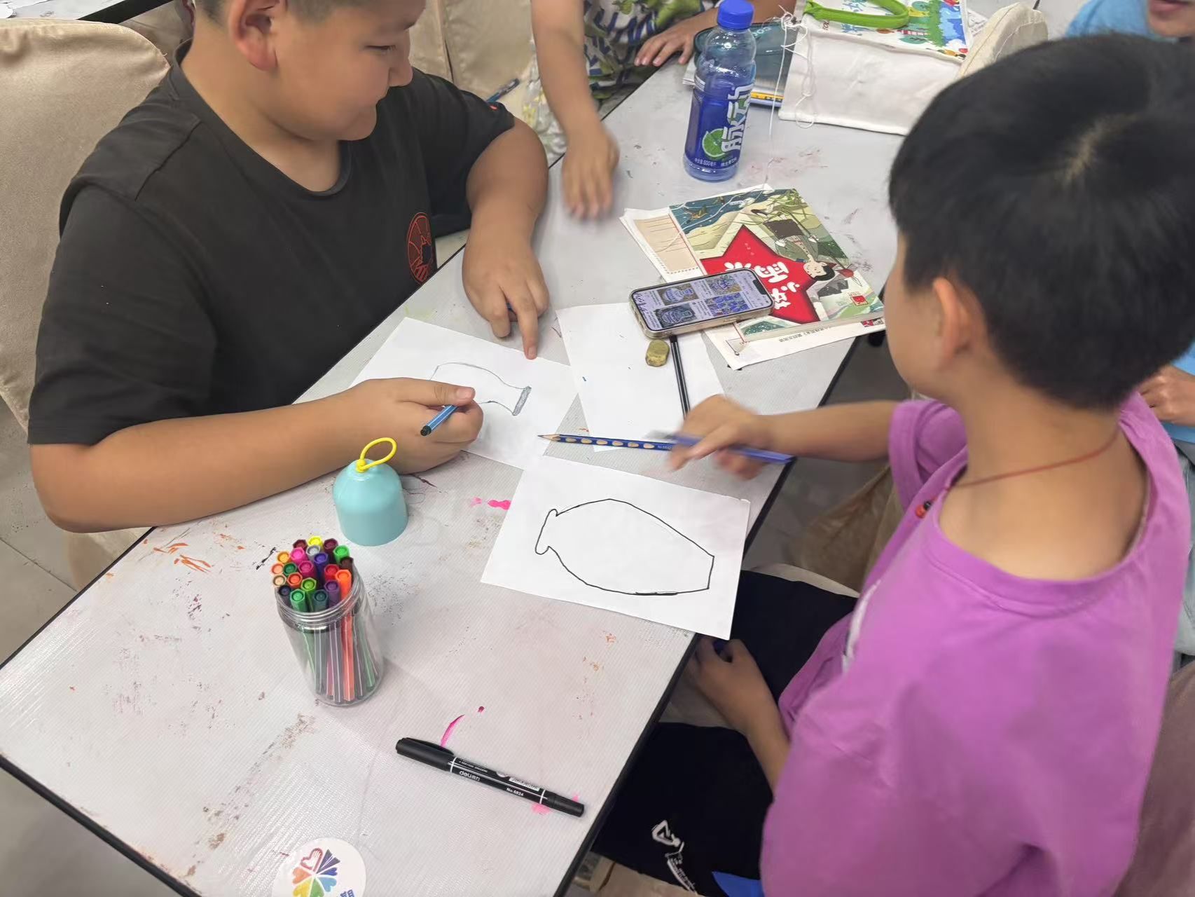 “大家可以模仿屏幕上的简笔画,更可以画出自己想象中的青花瓷。”随着一声“开始”,孩子们立刻投入创作:有的先用铅笔轻轻勾勒轮廓,反复修改直到满意才用黑笔描边,像个严谨的“小工匠”;有的则大胆下笔,线条流畅洒脱,转眼就画出一个别致的“青花罐”;还有的孩子别出心裁,在传统器型上加入了宇航员、彩虹等现代元素,让“古今对话”在画纸上悄然发生。