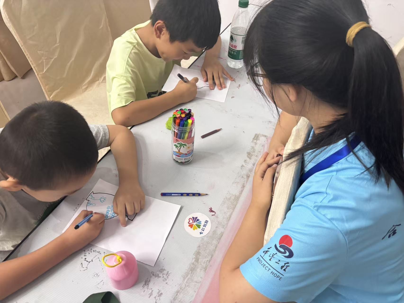 为了让孩子们从“旁观者”变为“参与者”,课程特意设置了手绘青花瓷画稿环节。在讲解完“拉坯、利坯、施釉、绘画、烧制”等基本工艺后,“小先生”们分发了画纸、彩笔等工具——这些材料均由“七彩假期”志愿服务项目暖心提供,为孩子们的文化实践保驾护航。