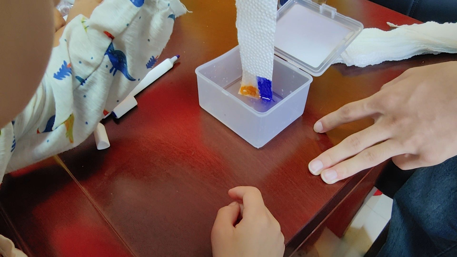 实验课开始,小先生展示了实验材料:一杯有颜色的水、纸巾、粗细各异的吸管、棉布以及海绵。在详细讲解实验步骤与安全注意事项后,孩子们迫不及待地动手操作起来。当他们把纸巾一端浸入彩色水中,神奇的现象发生了:水像是被一只无形的手牵引,沿着纸巾纤维缓缓上升,不一会儿,纸巾就被染上了绚丽的色彩。“哇,水真的往上跑了!”孩子们的惊叹声此起彼伏。