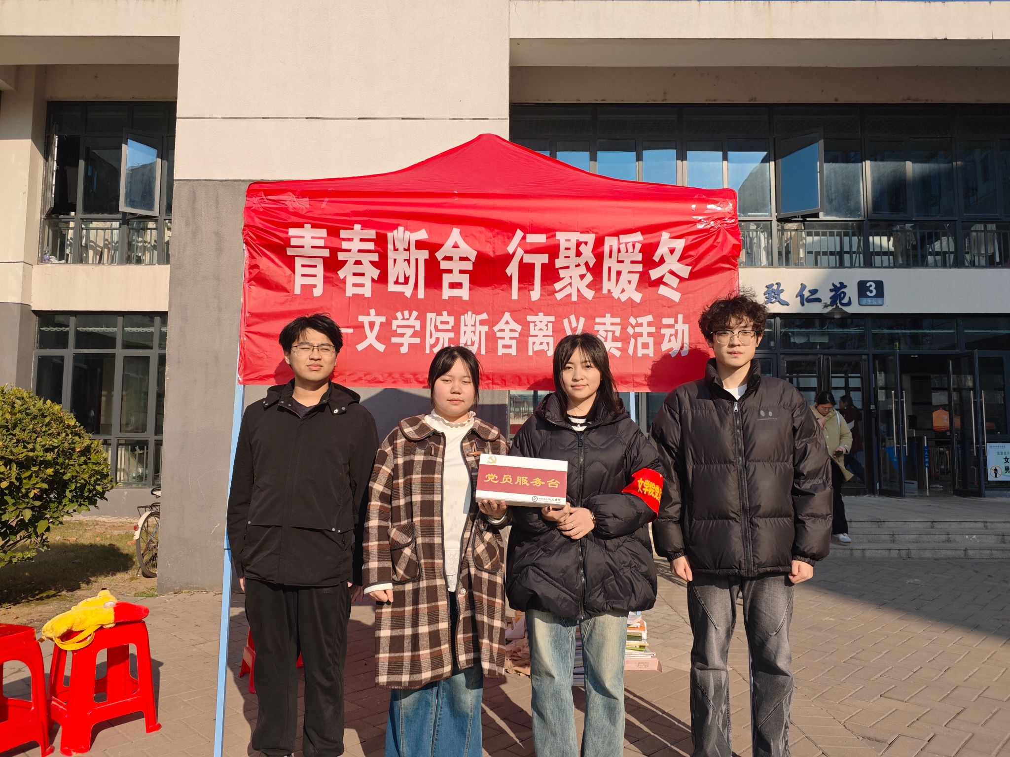 活动现场,“党员志愿服务岗”的红色标识格外醒目。学生党员和志愿者身穿冬装,佩戴袖标,在一个个帐篷下忙碌布置义卖摊位。帐篷悬挂着“青春断舍 行聚暖冬”的醒目标语,摊位上分类摆放着同学们捐赠的书籍、衣物、文具等闲置物品。党员志愿者带头整理物资、登记造册,用实际行动践行服务初心,成为寒冬中一抹温暖的色彩。