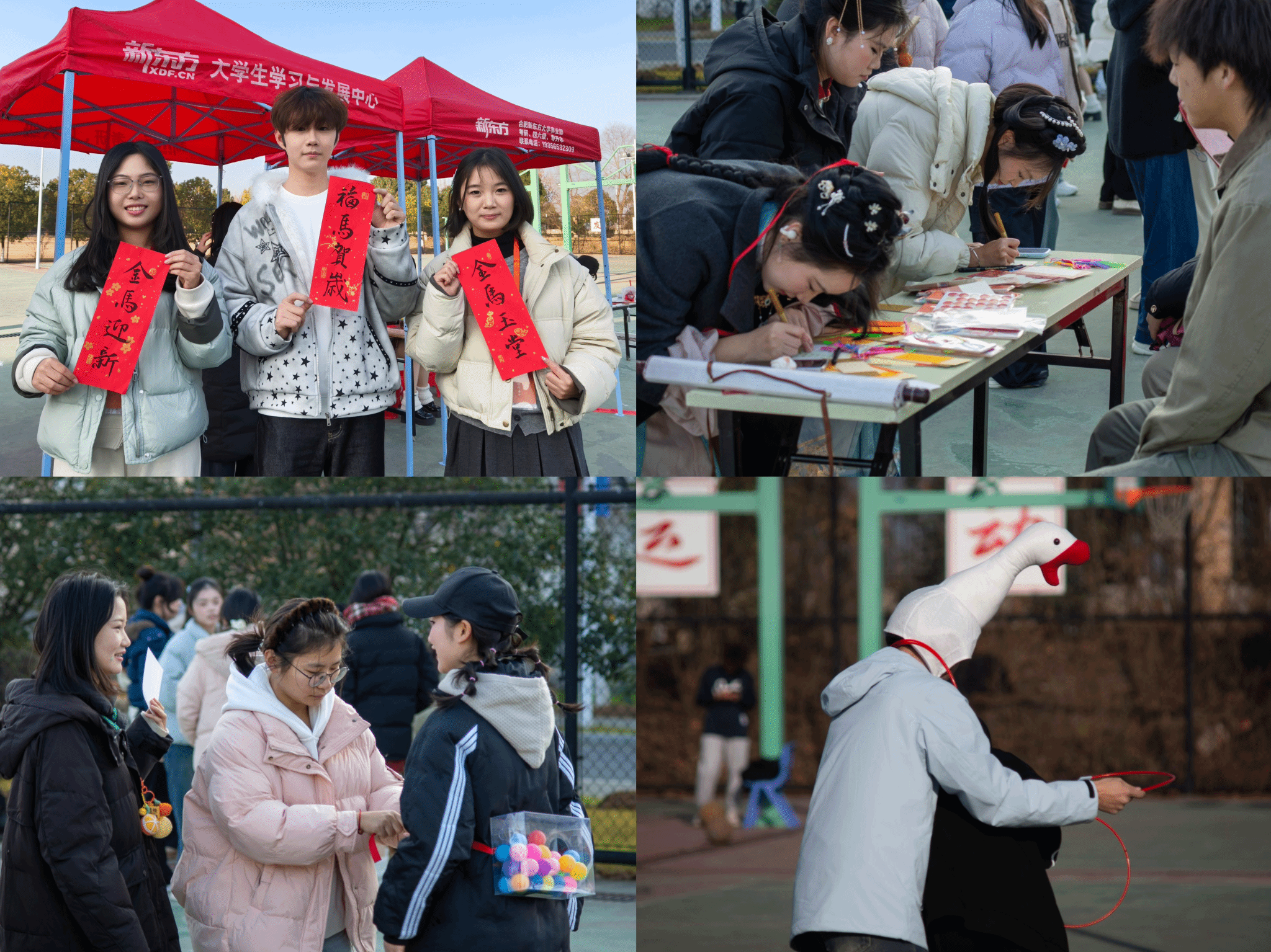 早在晚会开始前,直播的触角已延伸至午后热闹的新春活动集市。28日下午,ok138cn太阳集团设置的新春活动集市六大互动区域同步解锁年味狂欢,直播组穿梭其间,多机位记录精彩瞬间,让线上观众亦能“云”逛集市,感受浓浓年味。“迎春纳福·笔底舞龙蛇”专区内,书法特长学子挥毫泼墨,笔走龙蛇间,红底黑字的楹联与精巧别致的书桌小春联新鲜出炉,墨香氤氲中传递着最真挚的新春祝福;“岁启诗签·墨韵迎新春”里,同学们伏案提笔,将对新年的憧憬与期许诉诸笔墨,一张张书签、一枚枚明信片,都成为承载心愿的珍贵信物。成语接龙换套圈的脑力比拼、萌趣套大鹅的团队协作、诗韵转盘的诗词挑战、摇摆闯关的体能较量、憋笑大挑战的趣味互动,让现场欢声笑语不断。这些生动场景通过直播画面实时分享,吸引了众多线上观众互动留言。师生们在沉浸式体验中感受传统文化与趣味游戏的碰撞,收获满满的欢乐与惊喜。