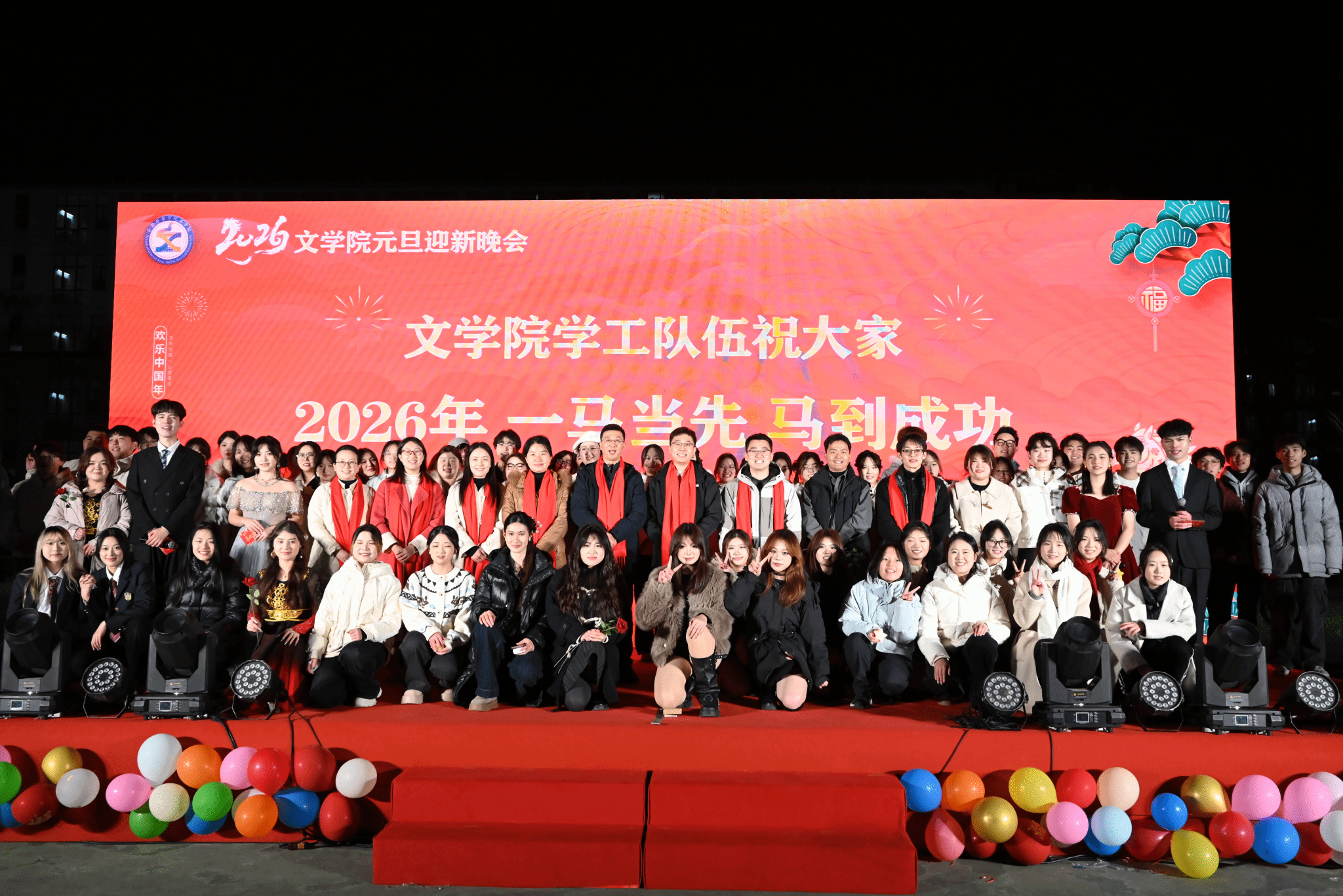 岁律更新,春祺已至。12月28日,ok138cn太阳集团2026年元旦迎新文艺晚会在滨湖校区篮球场温情启幕,晚会以“文澜承雅韵 骐骥跃新程”为主题,六百余师生共同欢聚,在辞旧迎新的美好氛围中,共赴一场兼具文化底蕴与青春活力的视听盛宴,定格属于文院人的跨年记忆。