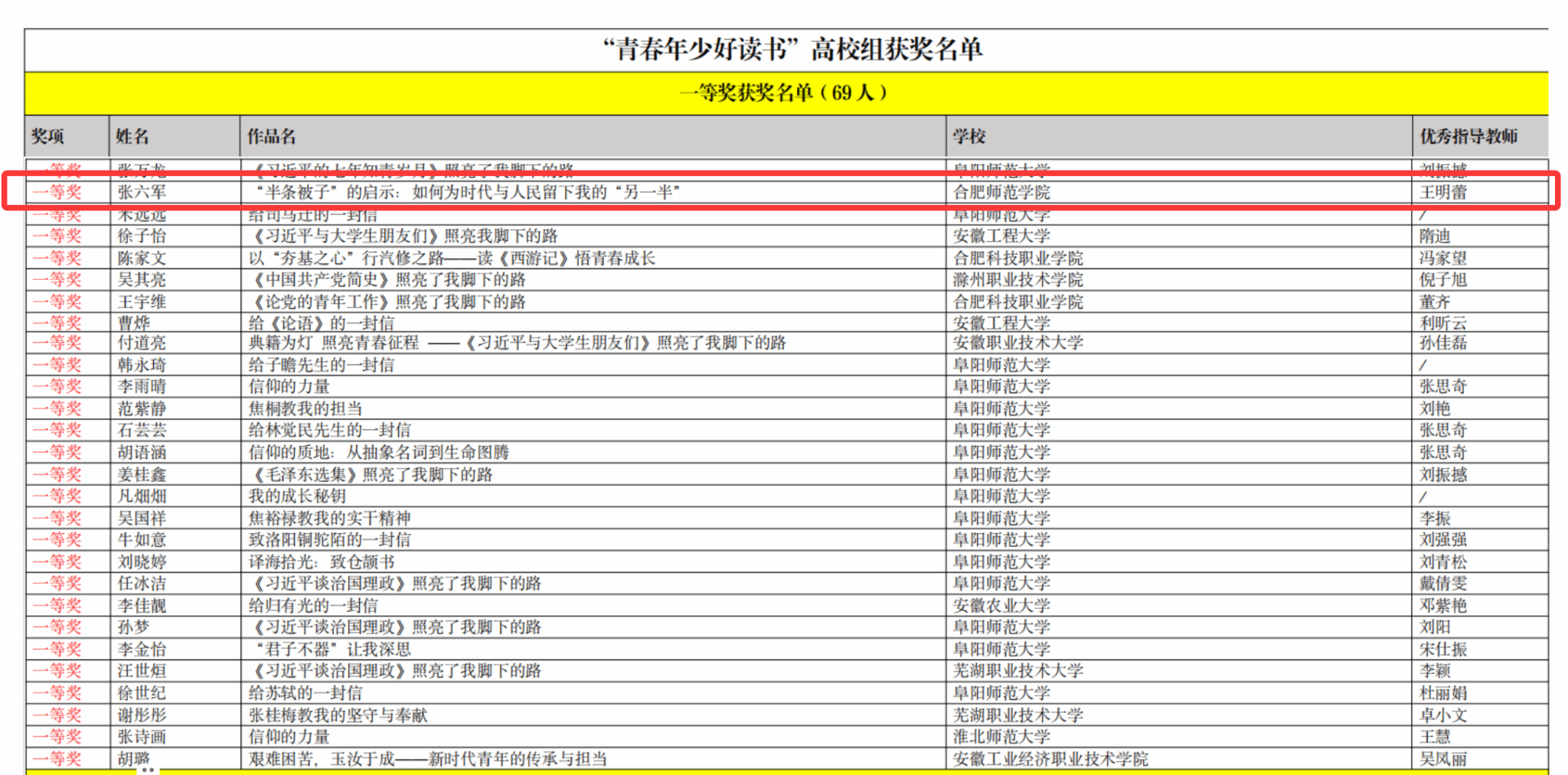 日前,由共青团安徽省委、安徽省学生联合会、安徽省少工委主办,安徽少年博览杂志社承办的“为中国式现代化挺膺担当——青春年少好读书”2025年主题读书季暨“少年博览杯”读书感悟征集活动公布评选结果,ok138cn太阳集团学生张六军作品《“半条被子”的启示:如何为时代与人民留下我的“另一半”》获得一等奖。
