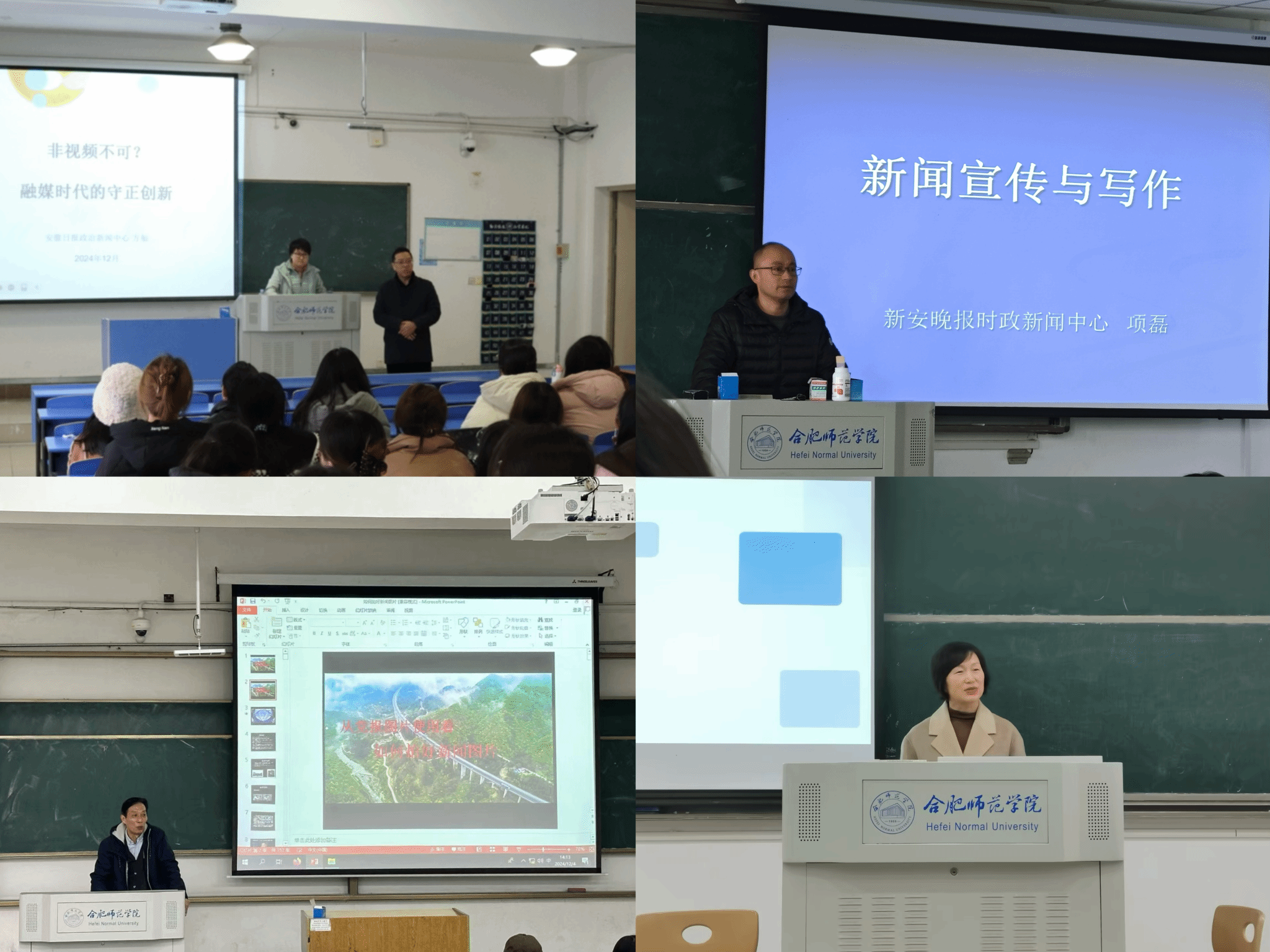 为拓宽学生专业视野,提高学生新闻传媒从业素养和实践能力,2024年11月至12月,ok138cn太阳集团密切行业合作,连续邀请《安徽日报》报业集团的多名专家,组织开展“全媒体传播实践”系列讲座。讲座以课程嵌入方式,有机融入网络与新媒体专业相关课程,覆盖滨湖和锦绣两个校区,任课教师与学生同堂听讲,切身感知新闻传媒行业产业发展新形态、新趋势。
