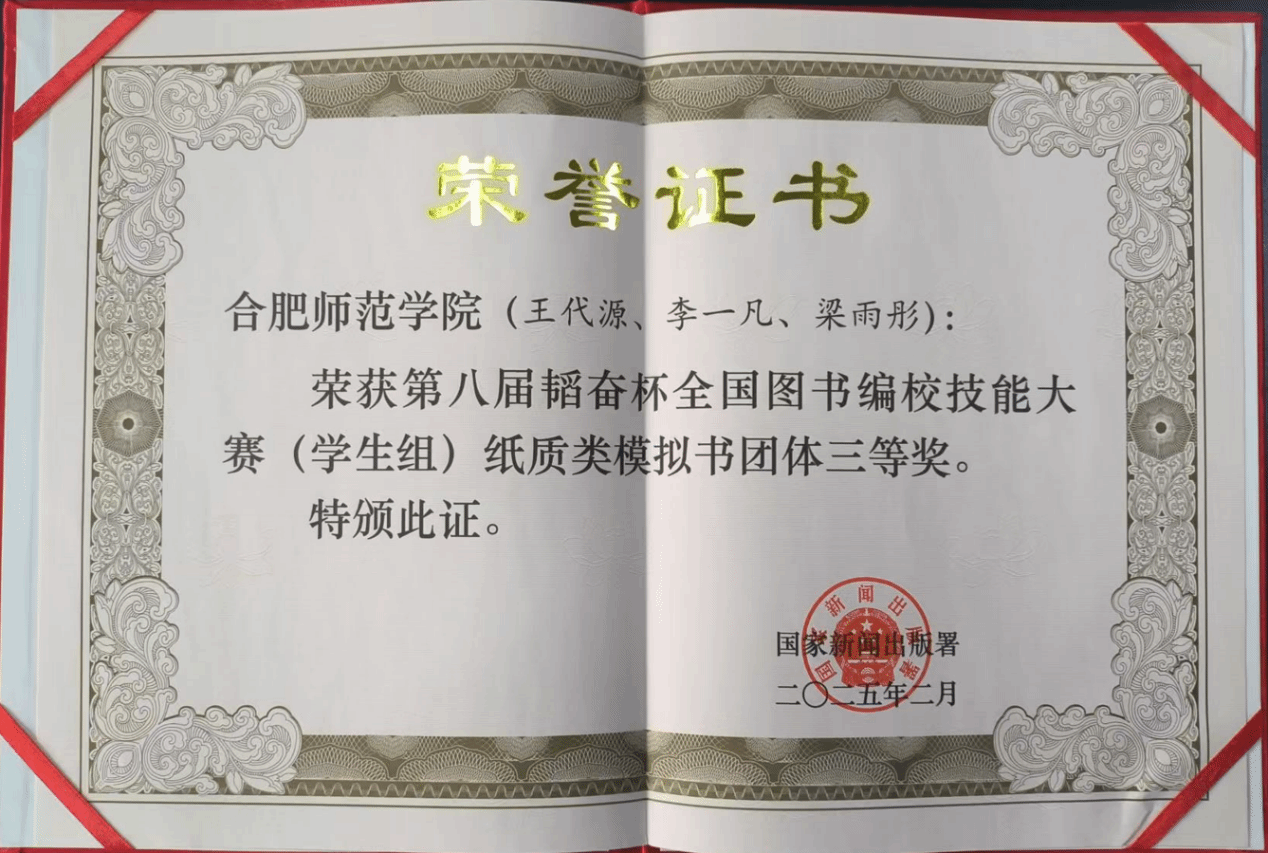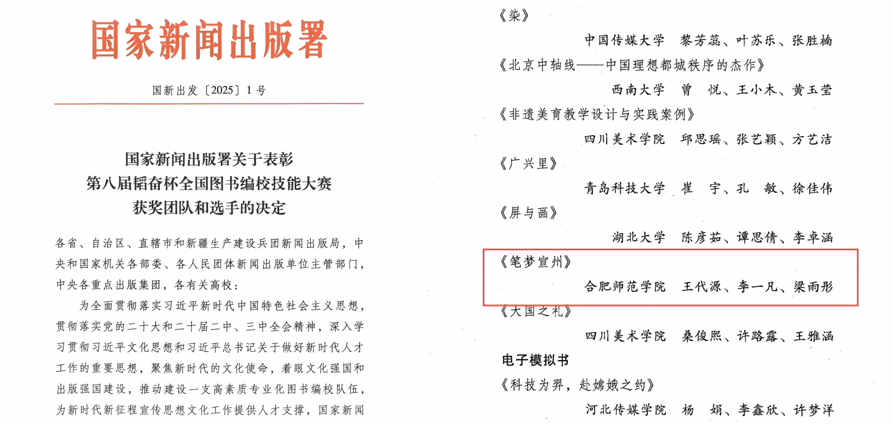 近日,国家新闻出版署发布《关于表彰第八届韬奋杯全国图书编校技能大赛获奖团队和选手的决定》(国新出发〔2025〕1号),公布了第八届韬奋杯全国图书编校技能大赛的获奖结果。ok138cn太阳集团学生王代源、李一凡,梁雨彤(美术与设计学院)团队提交的作品《笔梦宣州》获得了大赛学生组纸质模拟书类别的三等奖。此次获奖也是ok138cn太阳集团学子再次荣获该项赛事的全国三等奖。