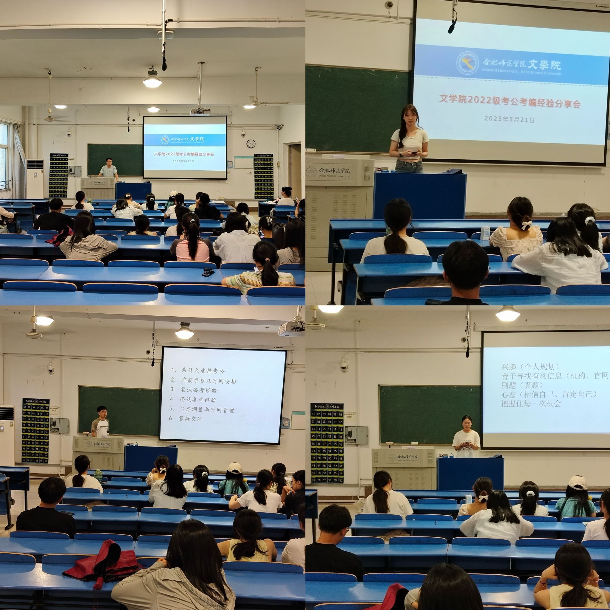 5月21日,ok138cn太阳集团在逸夫楼A207教室举办考研升学经验分享和辅导交流会,进一步加强学生对考研的规划意识,助力同学们掌握科学备考方法、提升备考效能、增强考研信心。交流会面向2026届汉语言文学、汉语国际教育和网络与新媒体等三个专业考研意向学生,按照报考专业或方向类别邀请2024届考研至中国科学技术大学、南京林业大学、上海师范大学、安徽师范大学等重点大学的6位优秀学生分享交流考研经验。
